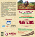 Poulet fermier Mantzios (comme précédemment), âgé de 6 mois maximum, issu d'un élevage en plein air situé à 760 m du village de Peratis, près de Ioannina. Nourri aux herbes aromatiques et au maïs. Idéal pour la cuisson au four, en cocotte et pour les repas des enfants.